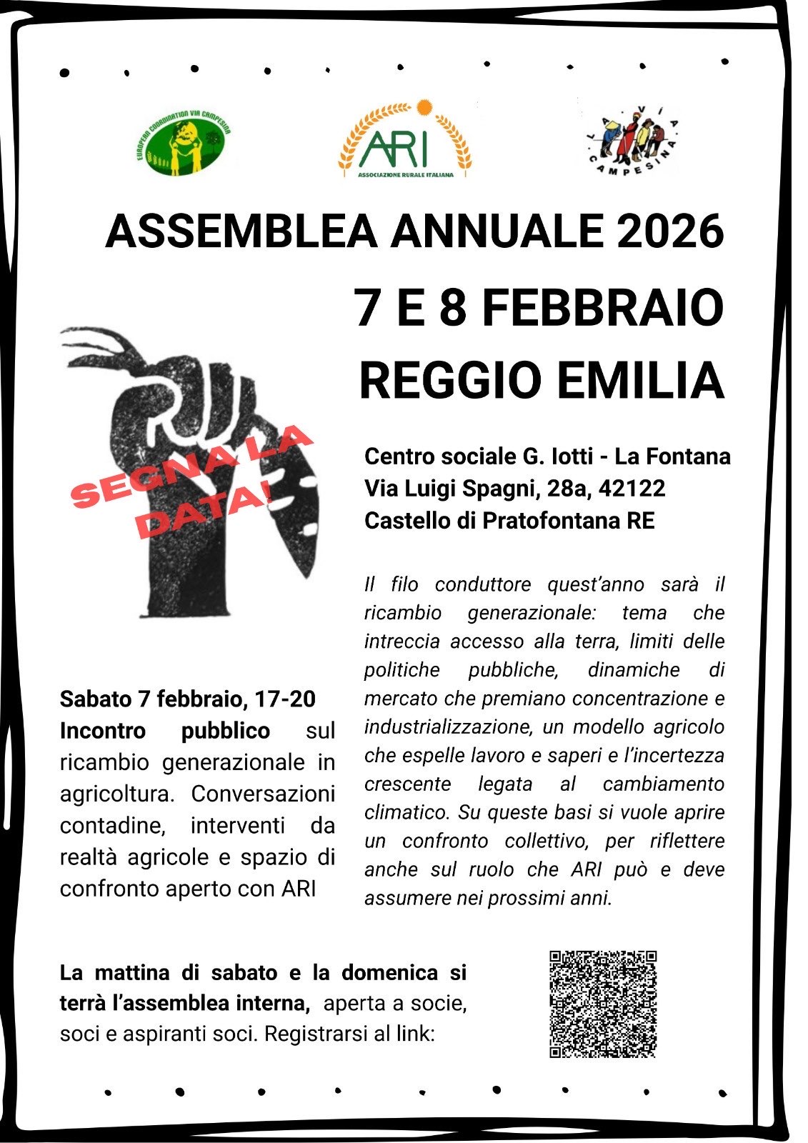 Facendo seguito alla nostra prima email, eccoci con nuovi aggiornamenti riguardo alla nostra Assemblea Annuale 2026, che si terrà presso il centro sociale “La Fontana” a Pratofontana, Reggio Emilia (via luigi Spagni 28/a) il 7 e 8 Febbraio.